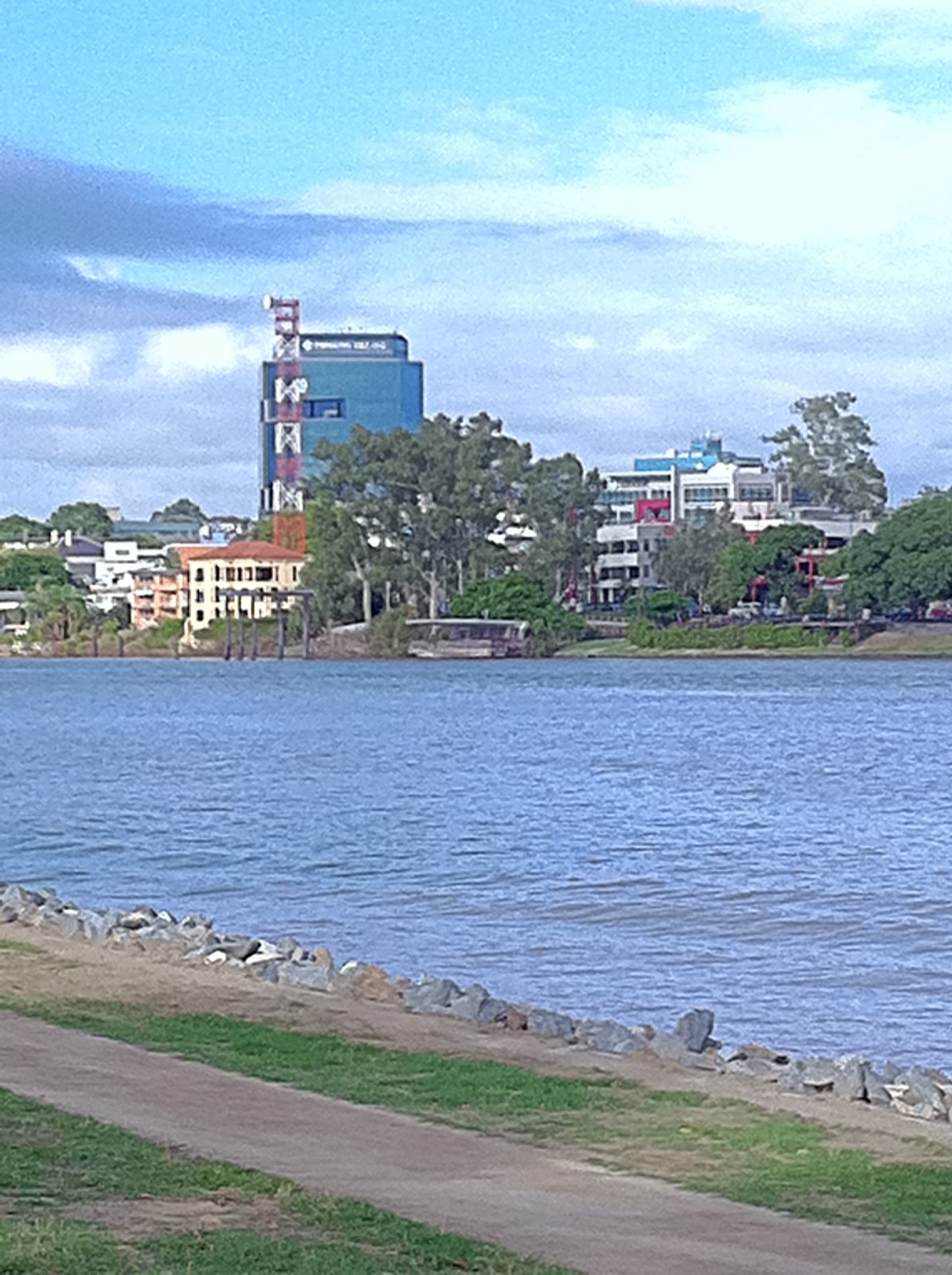 Bill's subject - the real Toowong, viewed from the muddy, recently repaired (look new rocks!) banks of West End.