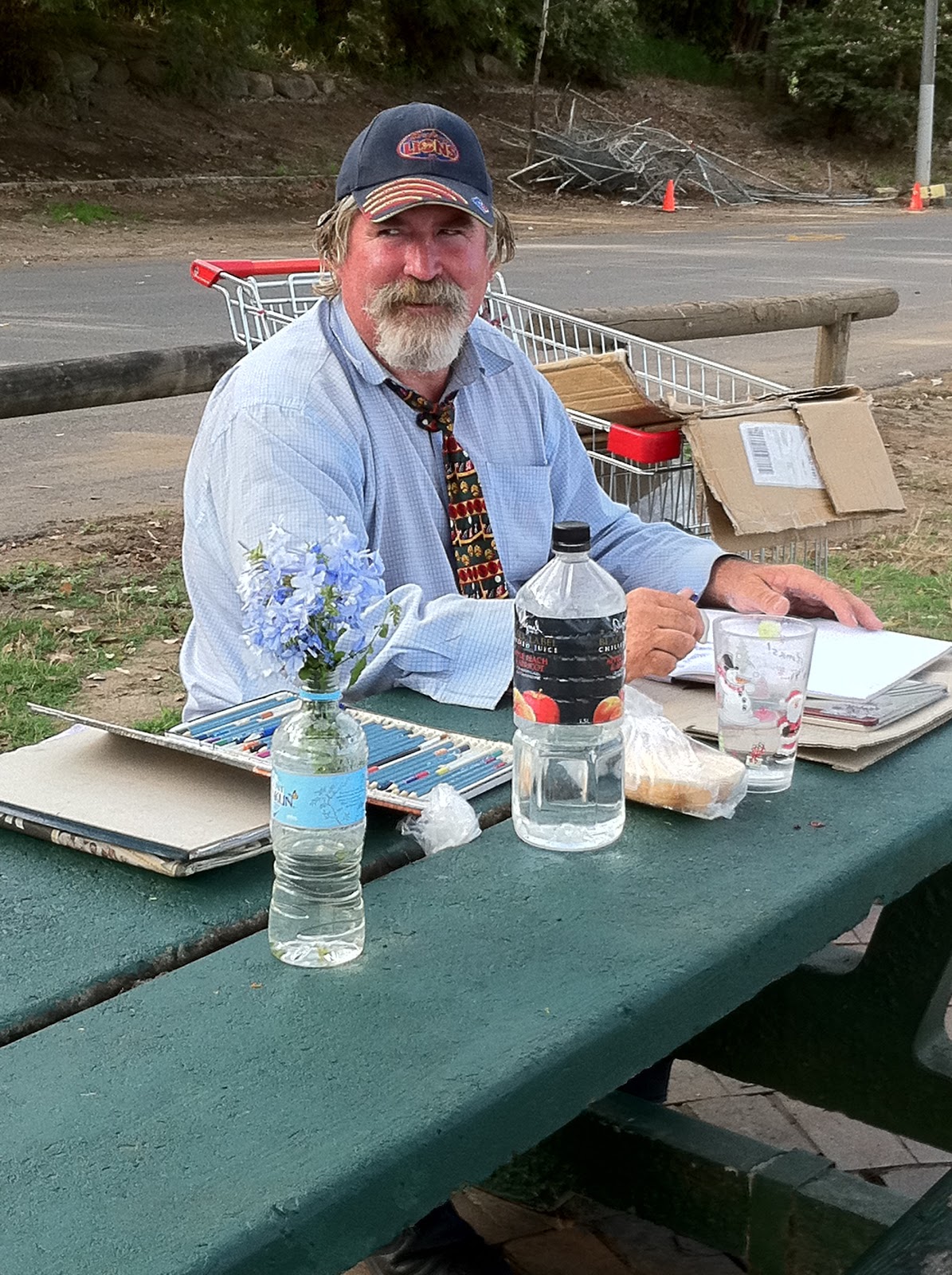 There he was, sketching away, on the riverbank, surrounded by flood carnage, his life's belongings neatly stacked in his shopping trolley and a little bottle of flowers elegantly displayed alongside his artist's tools. Some beauty amongst all the brown which was the flood. We got chatting about the flood, the view, his landscapes and the meaning of life.... as you do.